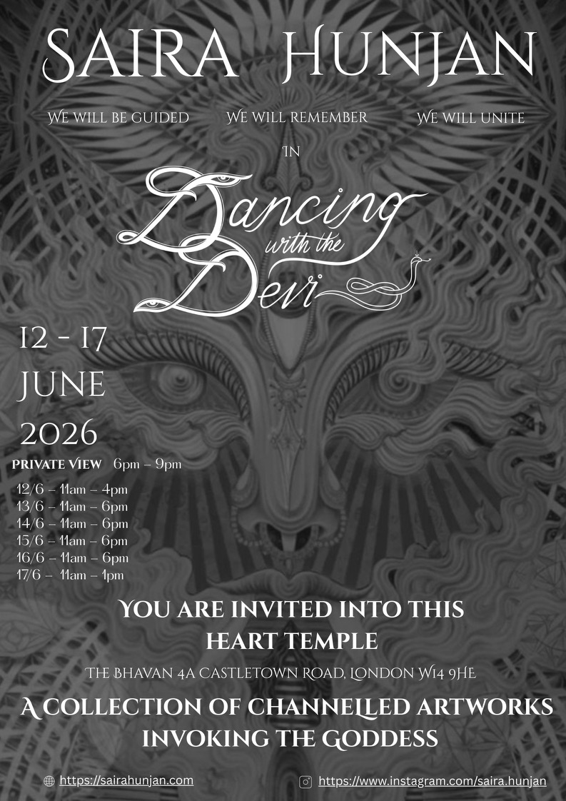Saira Hunjan’s new solo exhibition, Dancing with the Devi, opens this June at The Bhavan in London — a collection of channelled artworks invoking the goddess.